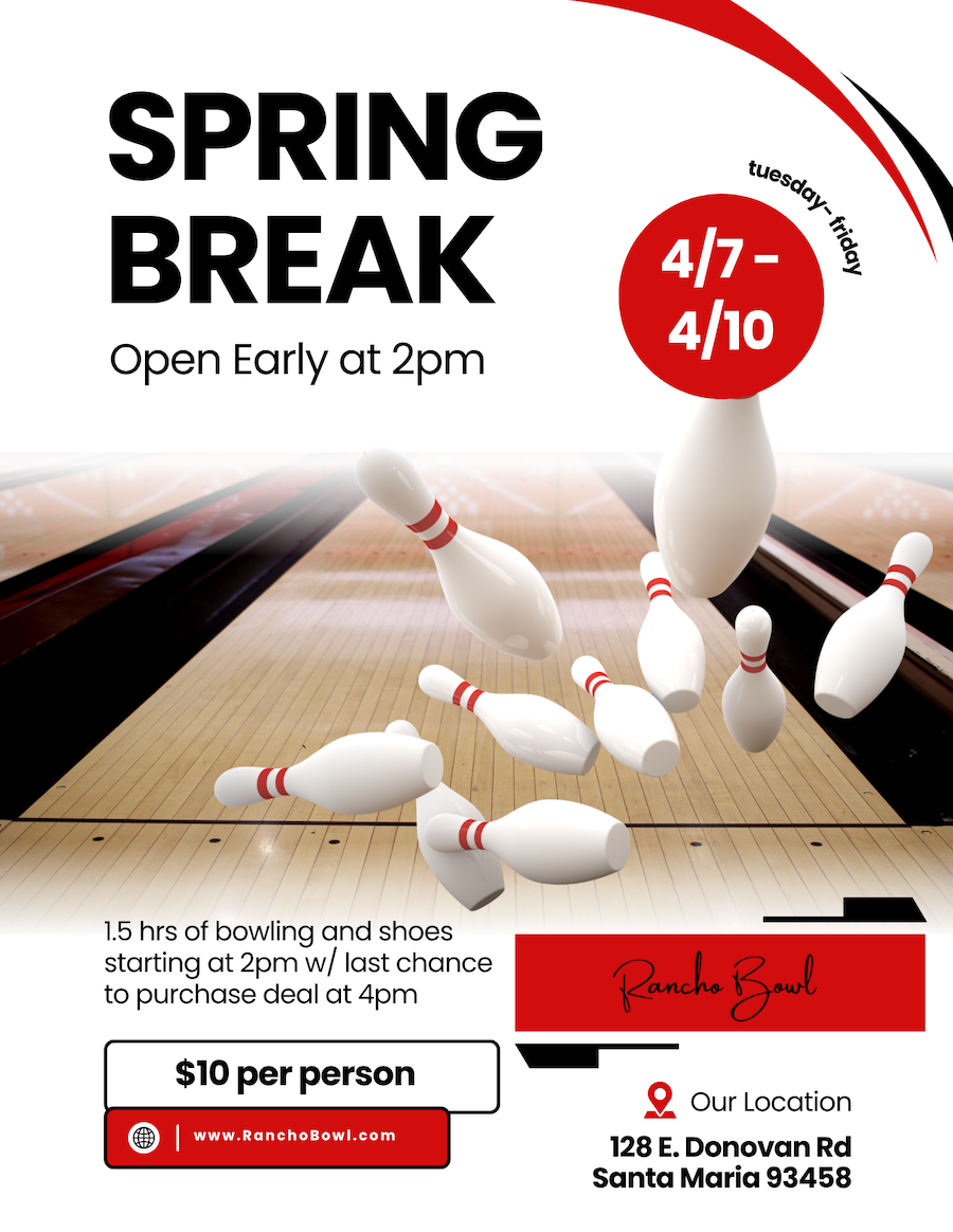 Spring Break is coming up, and weve got a great place to bring the crew! From April 7-10 (Tues-Fri), 2:00-4:00pm, get 1.5 hours of bowling and shoes for only $10 per bowler!!